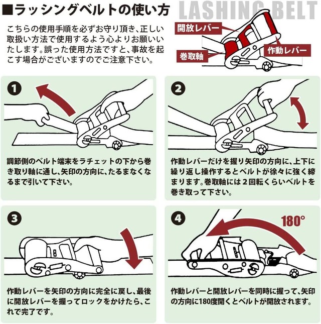 ● 幅の広いベルトで、荷物を損傷することなく安定した荷締めができます。